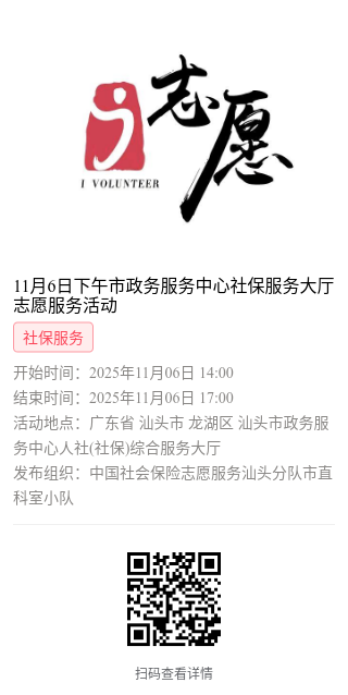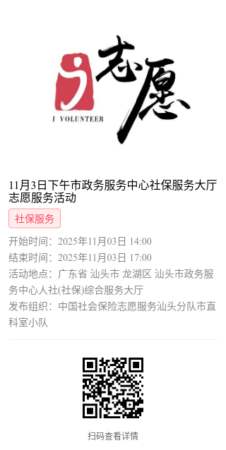 为充分保障我市社保志愿者权益,自2022年10月18日起,报名参加汕头市社保局和各分局志愿活动的同志须持有志愿者证并已激活,请各位志愿者遵照执行。