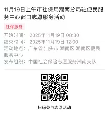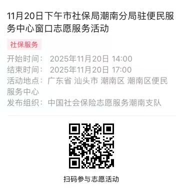 •   20251117日至1121日市社保局潮南分局驻便民服务中心窗口志愿服务活动,需要每一个可爱的你参与!