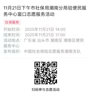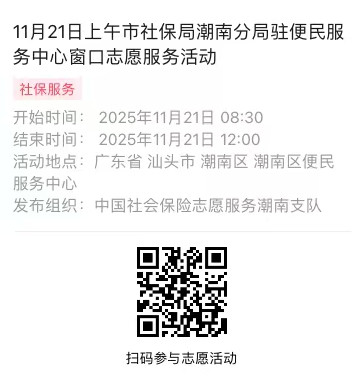 2025年11月17日至11月21日市社保局潮南分局驻便民服务中心窗口志愿服务活动报名链接