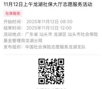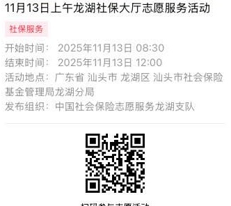 2025年11月10日至2025年11月14日市社保局龙湖分局大厅志愿服务活动,需要每一个可爱的你参与!