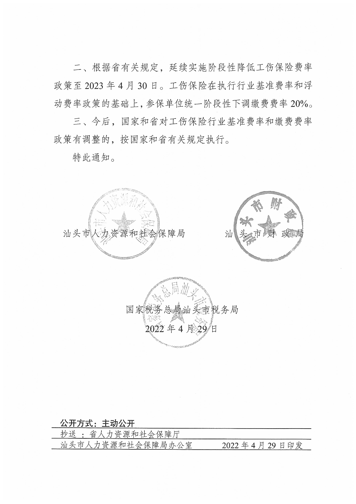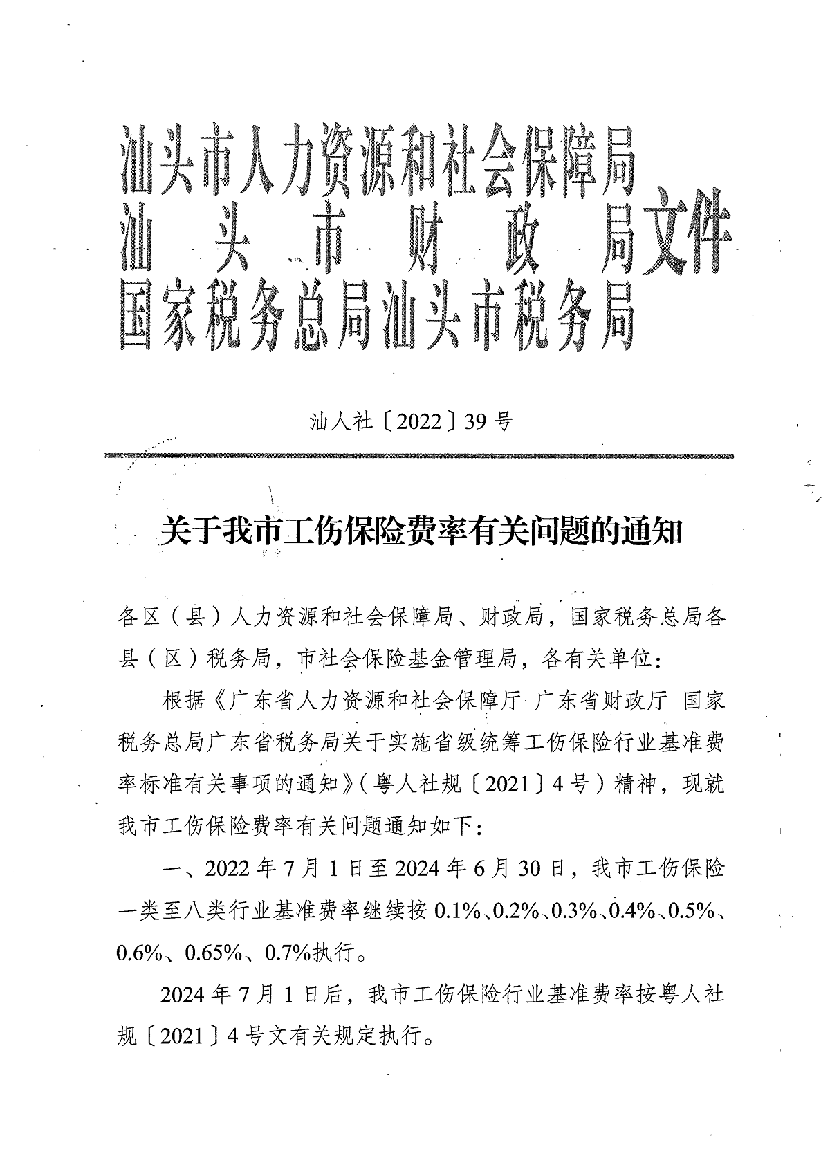 关于我市工伤保险费率有关问题的通知(汕人社〔2022〕39号)
