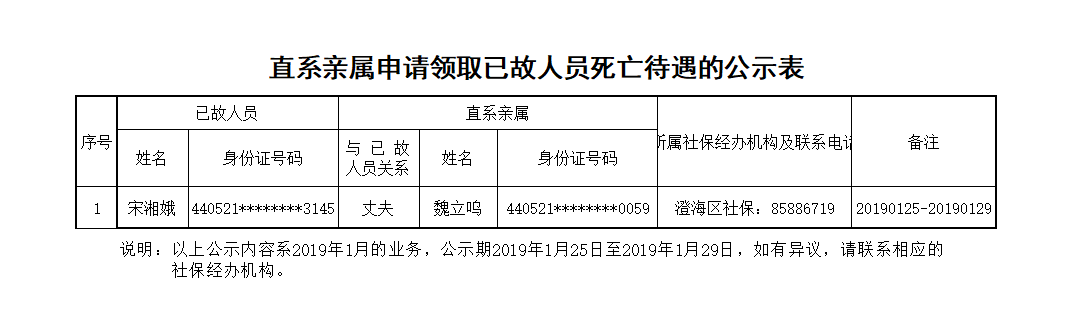 市社保澄海分局直系亲属申请领取已故人员死亡待遇的公示表(2018.01.25)