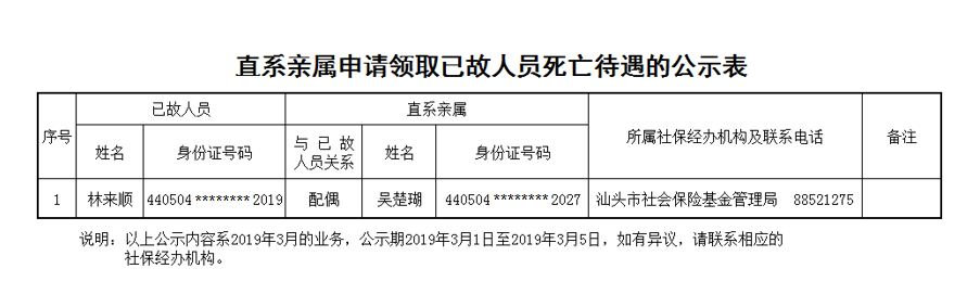 市社保局直系亲属申请领取已故人员死亡待遇的公示表(2019.03.01)