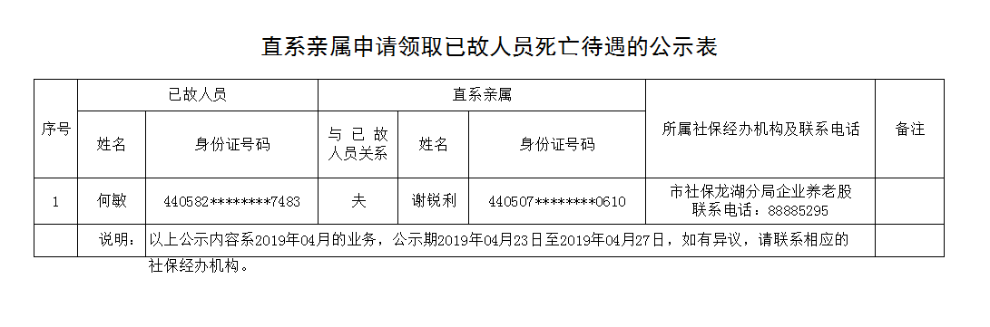 市社保龙湖分局直系亲属申请领取已故人员死亡待遇的公示表(2019.04.23)
