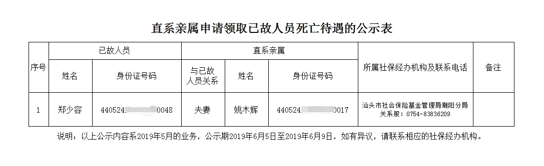 市社保潮阳分局直系亲属申请领取已故人员死亡待遇的公示表(2019.06.04)