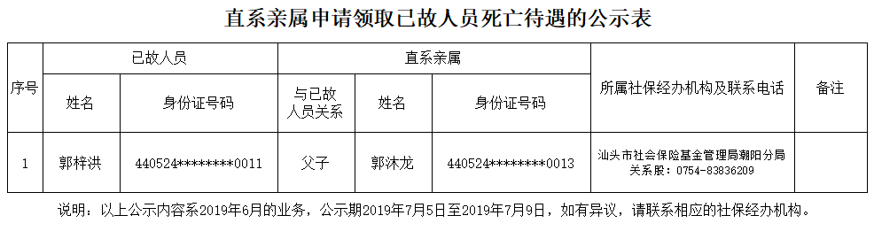 市社保潮阳分局直系亲属申请领取已故人员死亡待遇的公示表(2019.07.05)