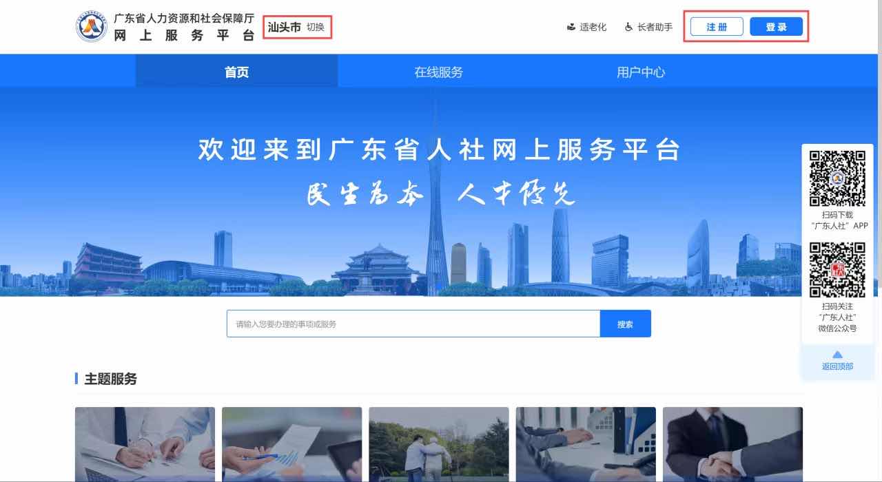 登录广东省人力资源和社会保障厅网上服务平台(下称“网上服务平台”)(https://ggfw.hrss.gd.gov.cn/gdggfw/index),定位选择“汕头市”。
