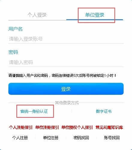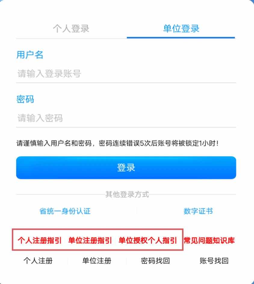 1、经办人员注册个人账号,登录并完成个人账户和单位账户的绑定工作。具体操作请查看登录界面下方红色字体。