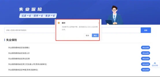 若单位账号认证等级不够,进行稳岗确认时,系统将提示“当前账号认证等级不足,是否通过法人实人认证办理业务”。