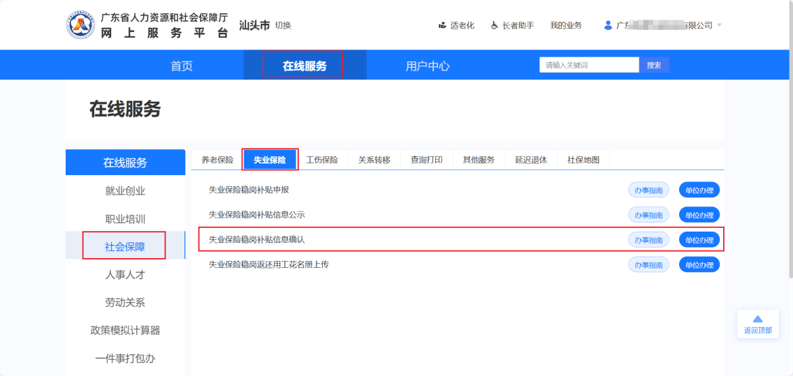 进行确认操作,按菜单路径依次点击:在线服务→社会保障→失业保险→失业保险稳岗返还信息确认,点击“立即办理”进入办理界面。