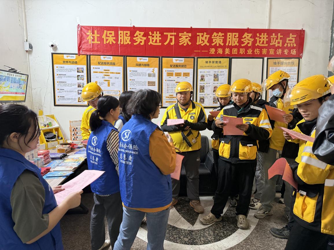 澄海区美团业务站点共有150位专送骑手,每天接单量达7000余单,本次活动选址于人流较为集中的美团业务站点,旨在直接面向新就业形态劳动者这一重点群体,打通社保政策宣传的“最后一公里”。醒目的横幅、整齐摆放的政策宣传折页、精心准备的小礼品,营造出浓厚的活动氛围,吸引了众多外卖骑手、站点管理人员及过往市民的驻足关注。澄海分局的工作人员聚焦职工参保登记、养老保险待遇计算与发放、个人养老金制度详解、就业创业补贴申领、职业伤害确认和预防、打击欺诈骗保行为等社会关注度高、与群众切身利益密切相关的热点难点问题,准备了详实的解答材料和通俗易懂的宣传品。区人社局与人寿保险汕头分公司的工作人员则协同进行社保政策的全面宣传,形成了政策宣讲的合力。