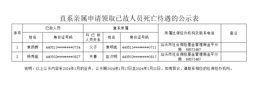 市社保局金平分局《直系亲属申请领取已故人员死亡待遇的公示表》(2024.01.17)