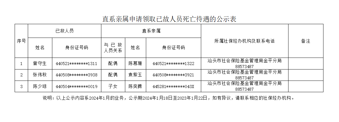 市社保局金平分局《直系亲属申请领取已故人员死亡待遇的公示表》(2024.01.18)