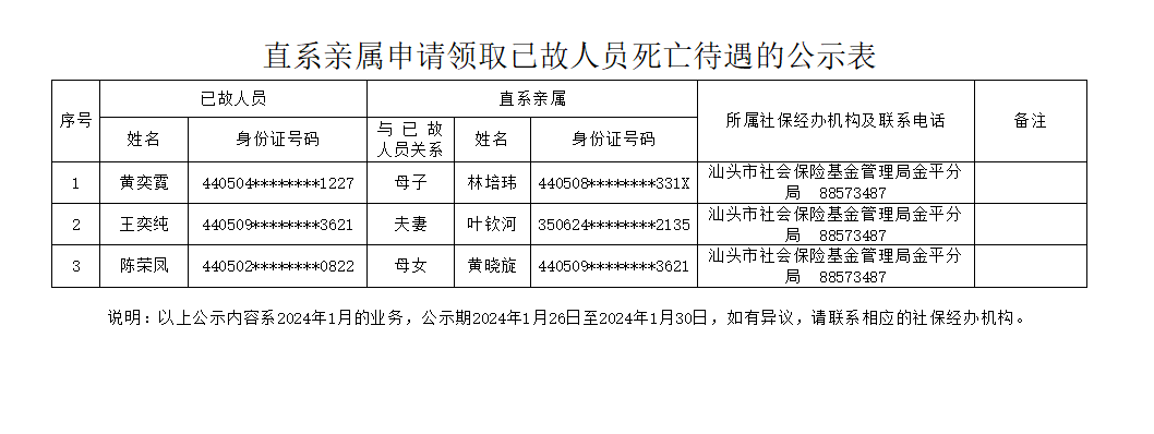 市社保局金平分局《直系亲属申请领取已故人员死亡待遇的公示表》(2024.01.26)