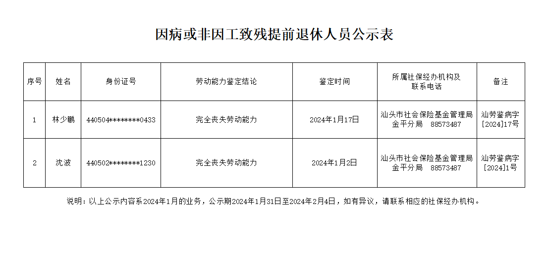 市社保局金平分局关于林少鹏等2人因病或非因工致残提前退休的公示(2024.01.31)