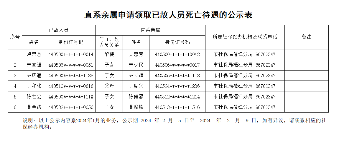 市社保局濠江分局《直系亲属申请领取已故人员死亡待遇的公示表》(2024.02.05)