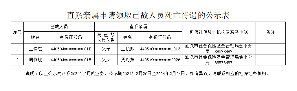 市社保局金平分局《直系亲属申请领取已故人员死亡待遇的公示表》(2024.02.20)