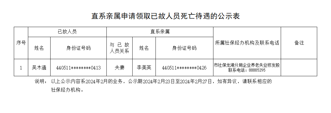 市社保局龙湖分局《直系亲属申请领取已故人员死亡待遇的公示表》(2024.02.23)