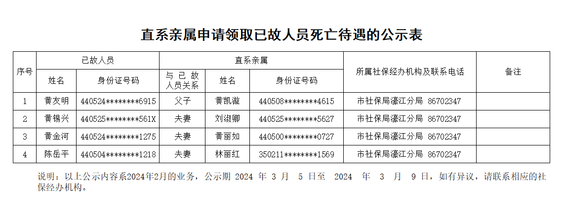 市社保局濠江分局《直系亲属申请领取已故人员死亡待遇的公示表》(2024.03.05)