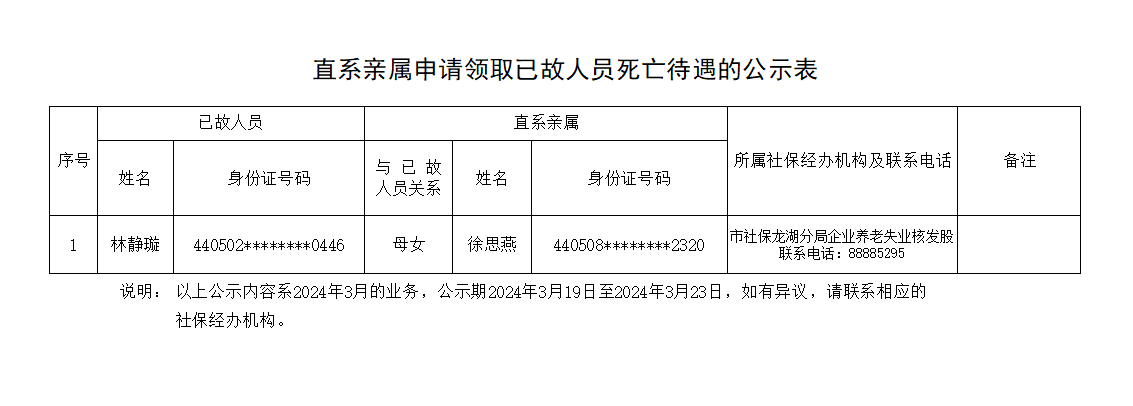 市社保局龙湖分局《直系亲属申请领取已故人员死亡待遇的公示表》(2024.03.19)