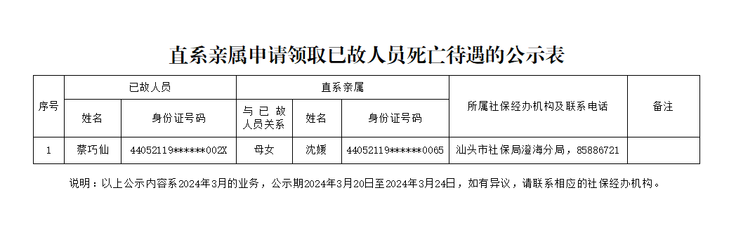 市社保局澄海分局《直系亲属申请领取已故人员死亡待遇的公示表》(2024.03.20)