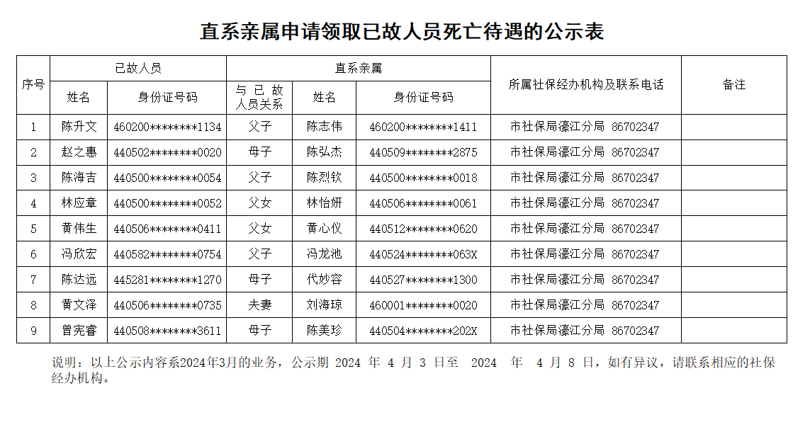 市社保局濠江分局《直系亲属申请领取已故人员死亡待遇的公示表》(2024.04.03)