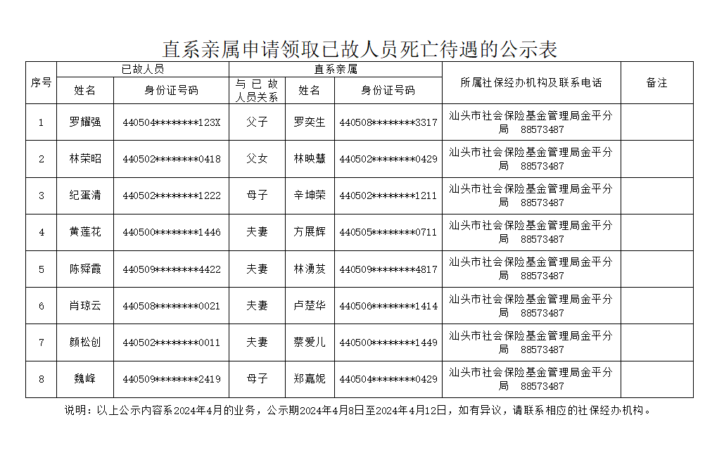 市社保局金平分局《直系亲属申请领取已故人员死亡待遇的公示表》(2024.04.08)