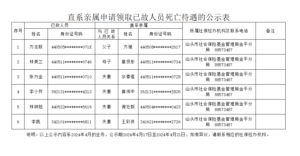 市社保局金平分局《直系亲属申请领取已故人员死亡待遇的公示表》(2024.04.17)