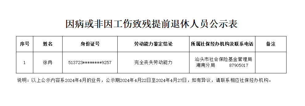 市社保局潮南分局关于徐冉因病或非因工致残提前退休的公示(2024.04.22)