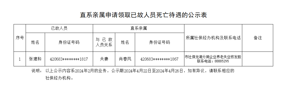 市社保局龙湖分局《直系亲属申请领取已故人员死亡待遇的公示表》(2024.04.22)