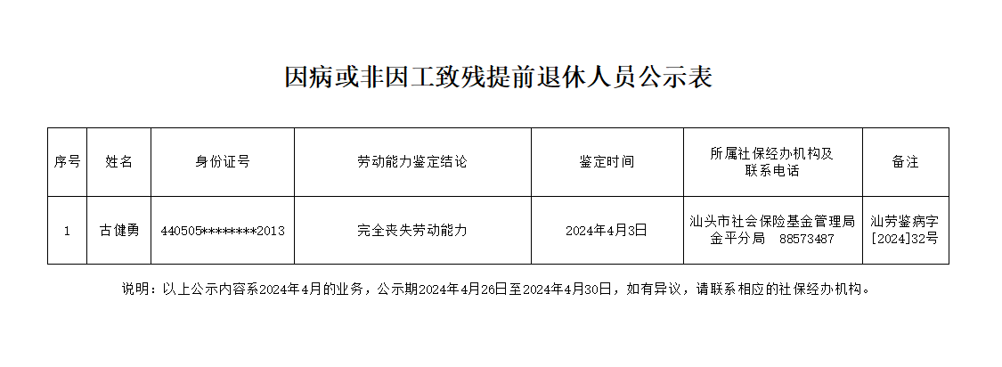 市社保局金平分局关于古健勇因病或非因工致残提前退休的公示(2024.04.26)