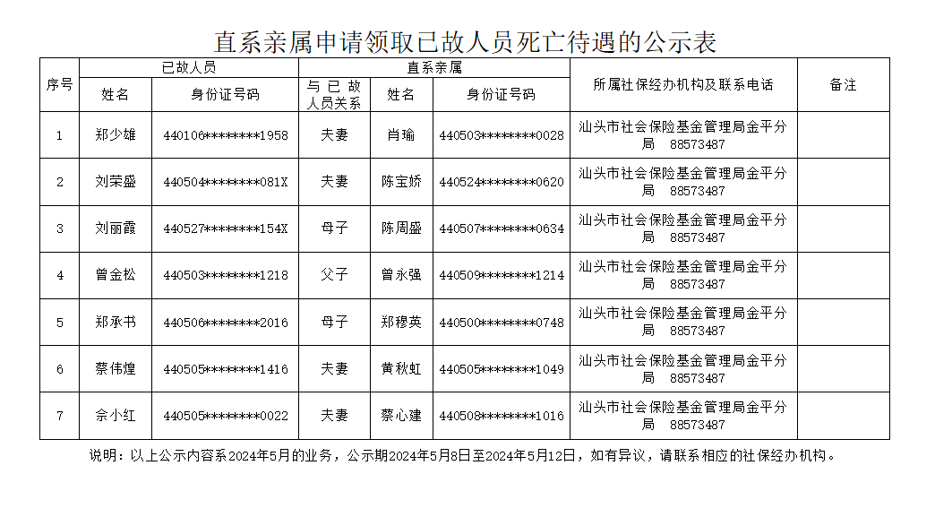 市社保局金平分局《直系亲属申请领取已故人员死亡待遇的公示表》(2024.05.08)