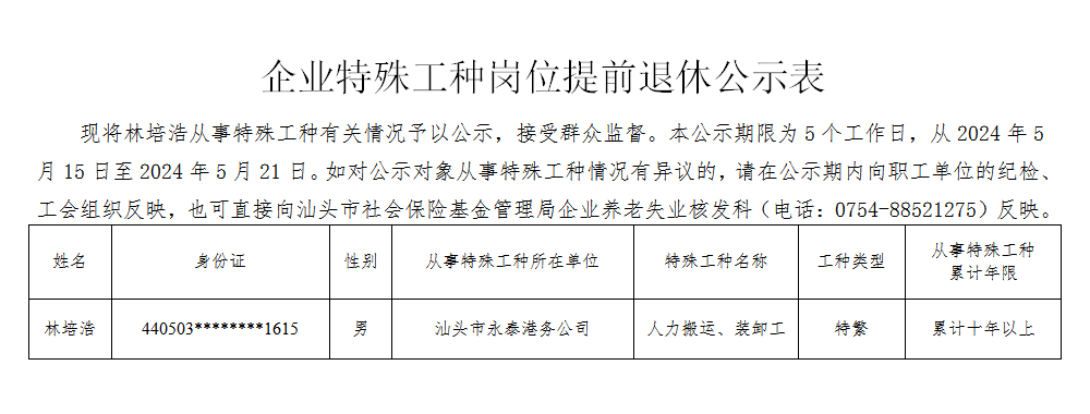市社保局关于林培浩的企业特殊工种岗位提前退休公示表(2024.05.15)