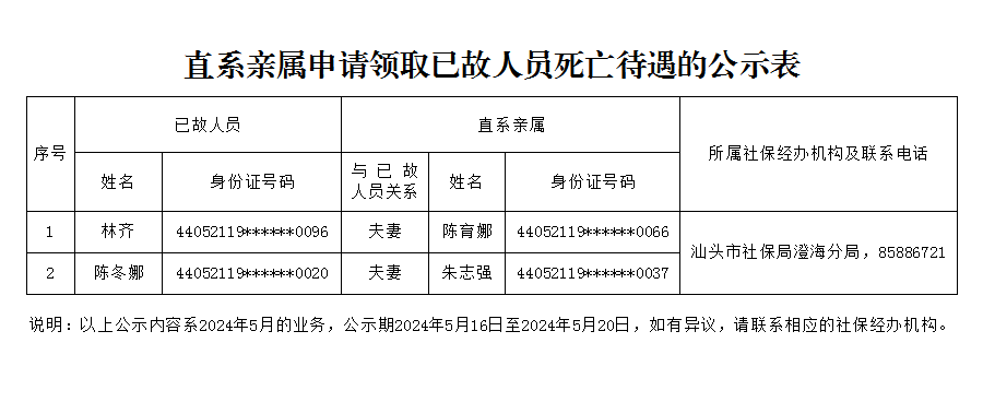 市社保局澄海分局《直系亲属申请领取已故人员死亡待遇的公示表》(2024.05.16)