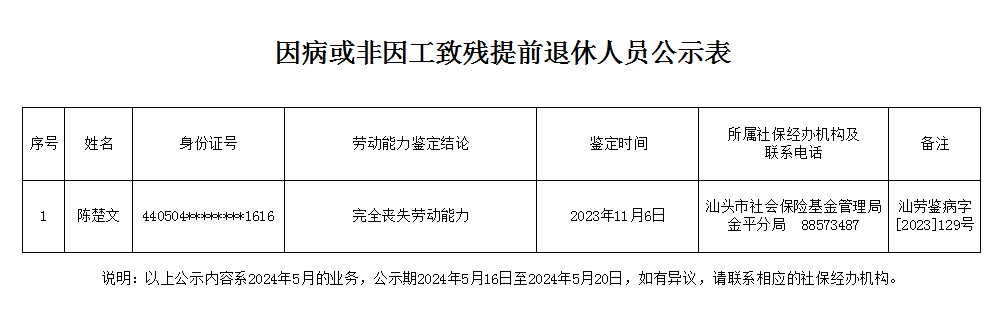 市社保局金平分局关于陈楚文因病或非因工致残提前退休的公示(2024.05.16)