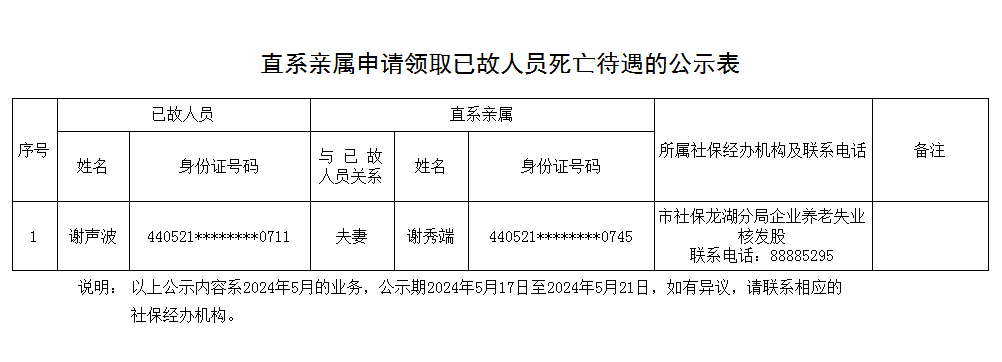市社保局龙湖分局《直系亲属申请领取已故人员死亡待遇的公示表》(2024.05.17)
