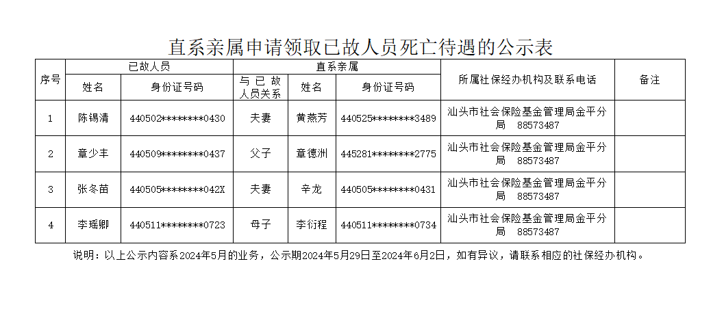 市社保局金平分局《直系亲属申请领取已故人员死亡待遇的公示表》(2024.05.29)