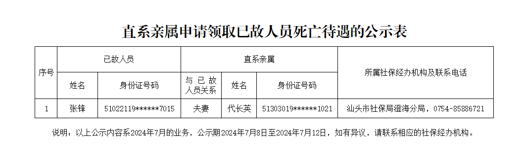 市社保局澄海分局《直系亲属申请领取已故人员死亡待遇的公示表》(2024.7.08)