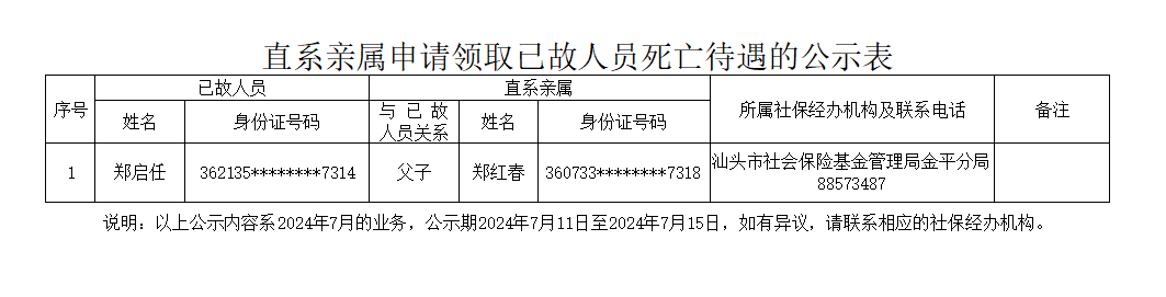 市社保局金平分局《直系亲属申请领取已故人员死亡待遇的公示表》(2024.07.11)