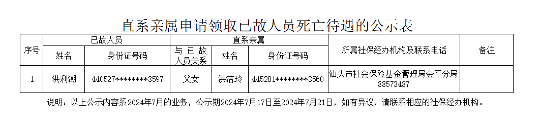 市社保局金平分局《直系亲属申请领取已故人员死亡待遇的公示表》(2024.07.17)