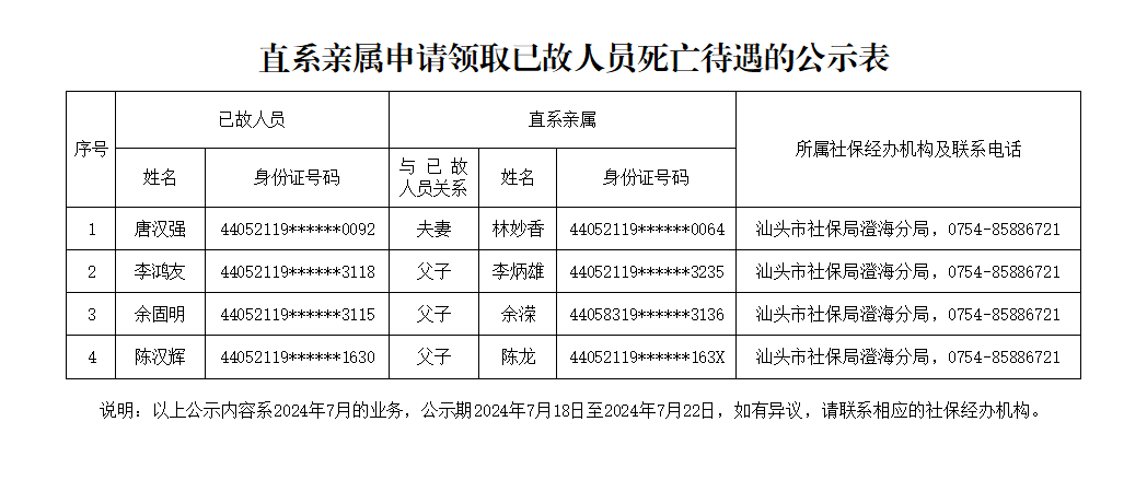 市社保局澄海分局《直系亲属申请领取已故人员死亡待遇的公示表》(2024.7.18)