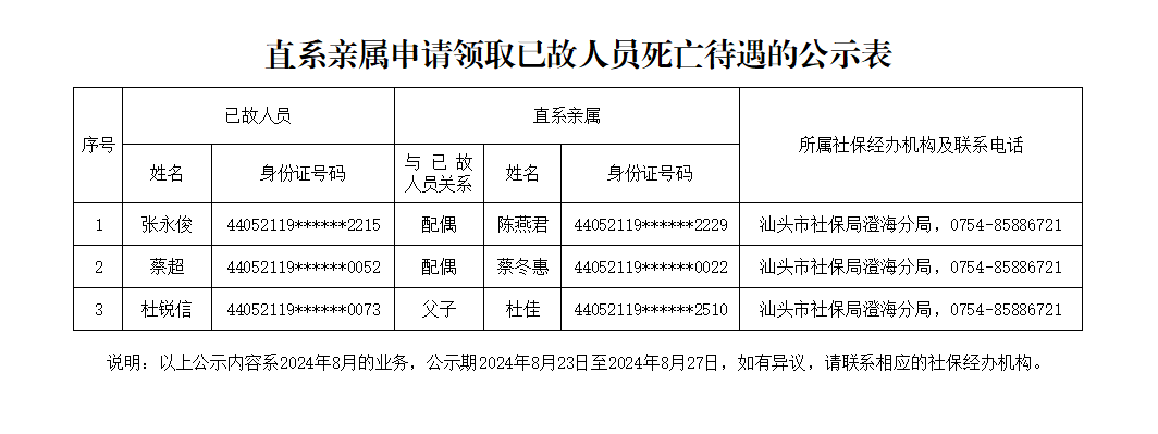 市社保局澄海分局《直系亲属申请领取已故人员死亡待遇的公示表》(2024.08.23)