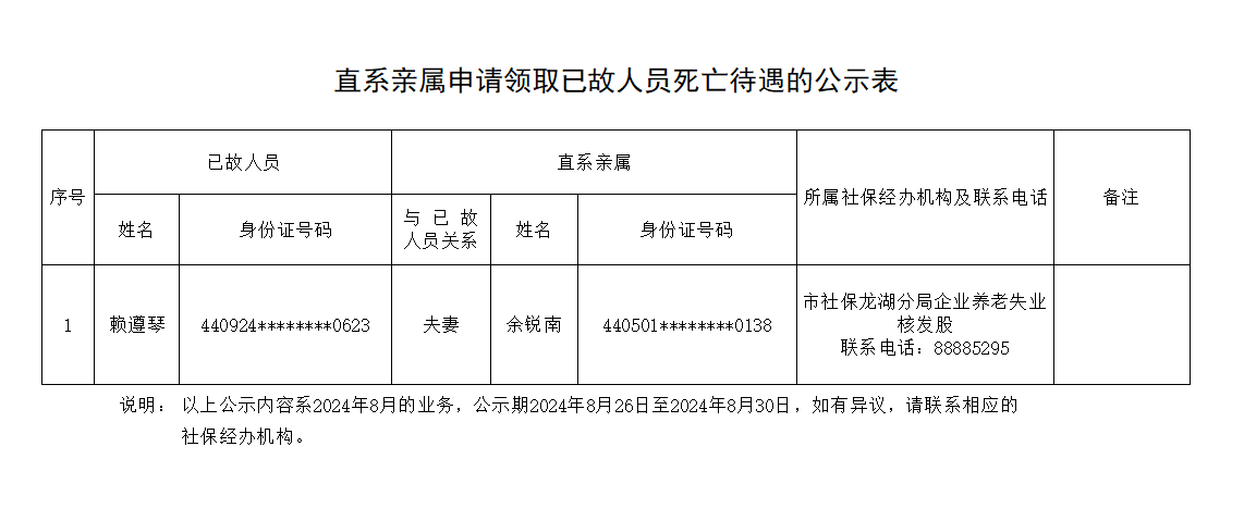 市社保局龙湖分局《直系亲属申请领取已故人员死亡待遇的公示表》(2024.08.26)
