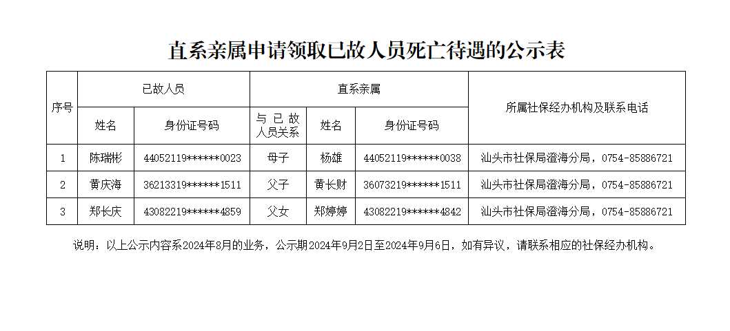 市社保局澄海分局《直系亲属申请领取已故人员死亡待遇的公示表》(2024.09.02)