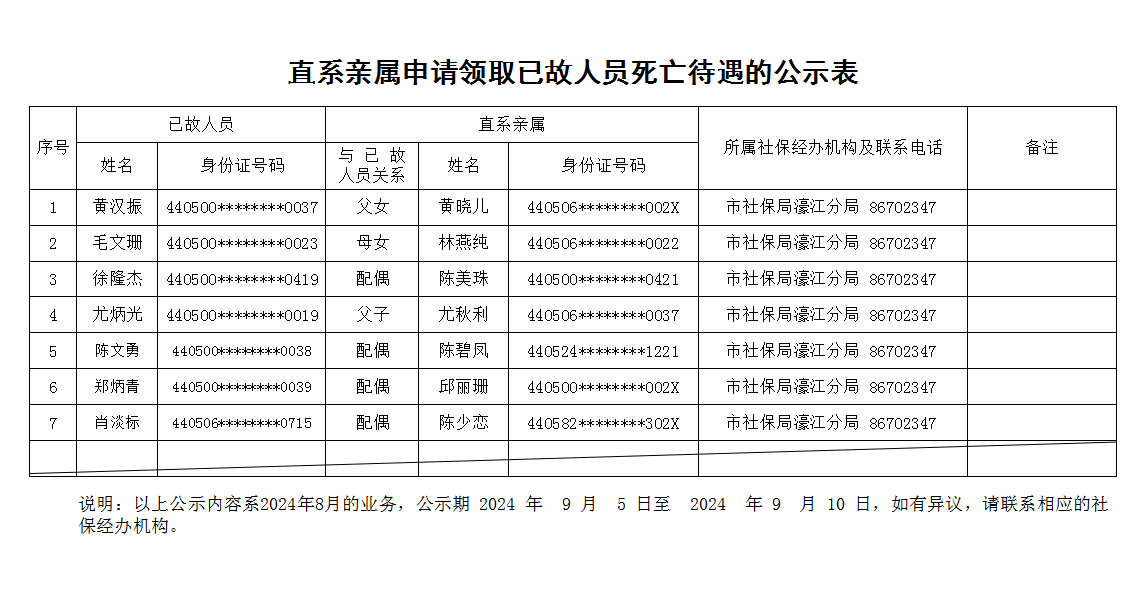 市社保局濠江分局《直系亲属申请领取已故人员死亡待遇的公示表》(2024.09.05)