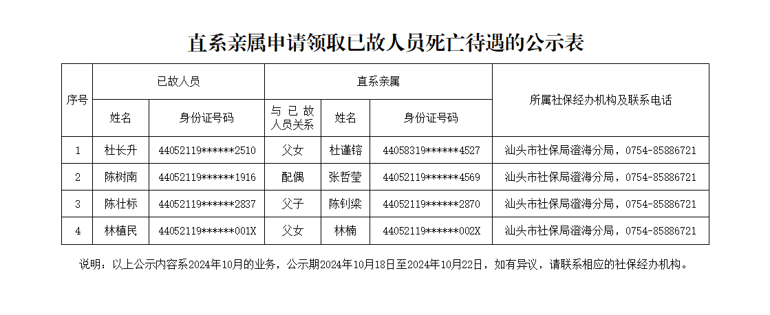 市社保局澄海分局《直系亲属申请领取已故人员死亡待遇的公示表》(2024.10.18)