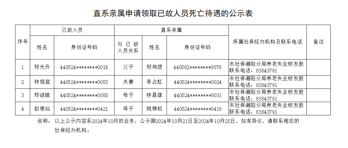 市社保局潮阳分局《直系亲属申请领取已故人员死亡待遇的公示表》(2024.10.21)