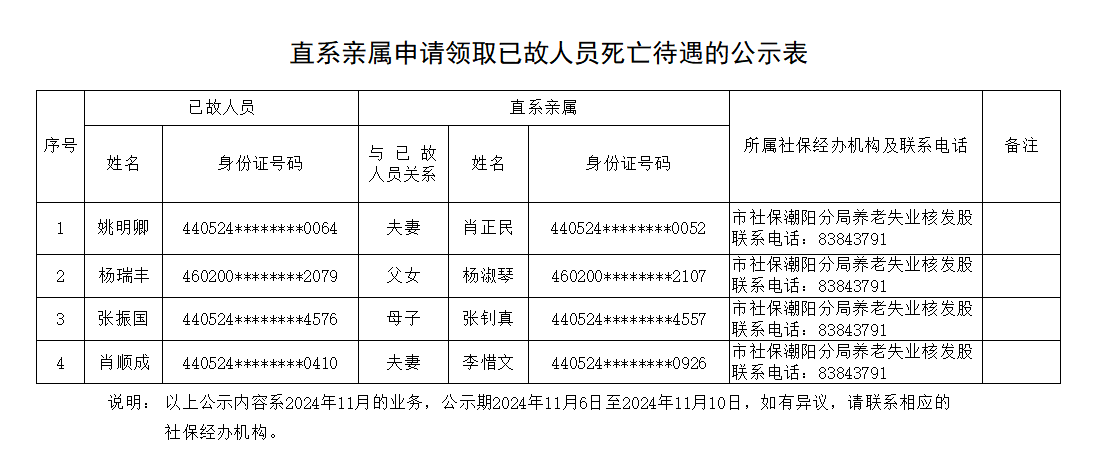 市社保局澄海分局《直系亲属申请领取已故人员死亡待遇的公示表》(2024.11.06)