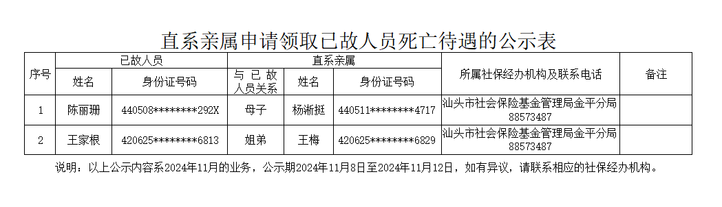 市社保局金平分局《直系亲属申请领取已故人员死亡待遇的公示表》(2024.11.08)