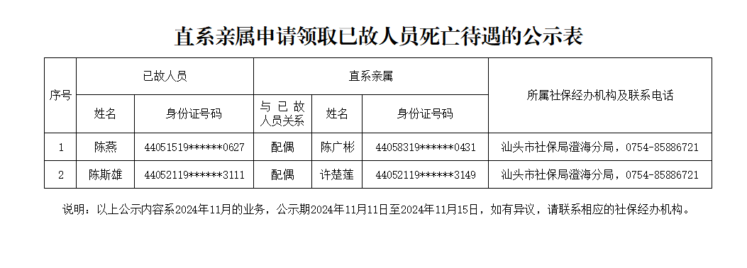 市社保局澄海分局《直系亲属申请领取已故人员死亡待遇的公示表》(2024.11.11)